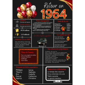 Affiche anniversaire 1964 personnalisable disponible pour les années 1924 à 2014 imprimé A4 A3 sans cadre Idée cadeau