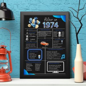 Affiche anniversaire 1974 disponible pour les années 1924 à 2014 Format numérique ou imprimé A4 A3 sans cadre Idée cadeau mariage noel