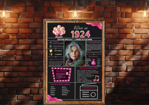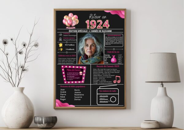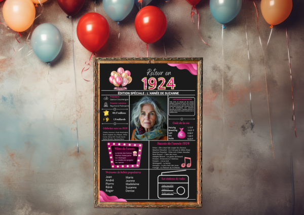 Nous proposons des affiches anniversaires pour l’année 1924 personnalisables avec l’ajout de photos et de textes. Nous disposons des affiches pour toutes les années de 1924 à 2014. Merci d’indiquer l’année et les informations de personnalisation au moment de la commande