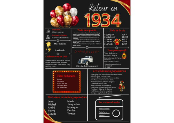 Soyez le premier à laisser votre avis sur “Affiche anniversaire 1934 disponible pour les années 1924 à 2014 Format numérique uniquement Idée cadeau mariage noel 90 ans”
