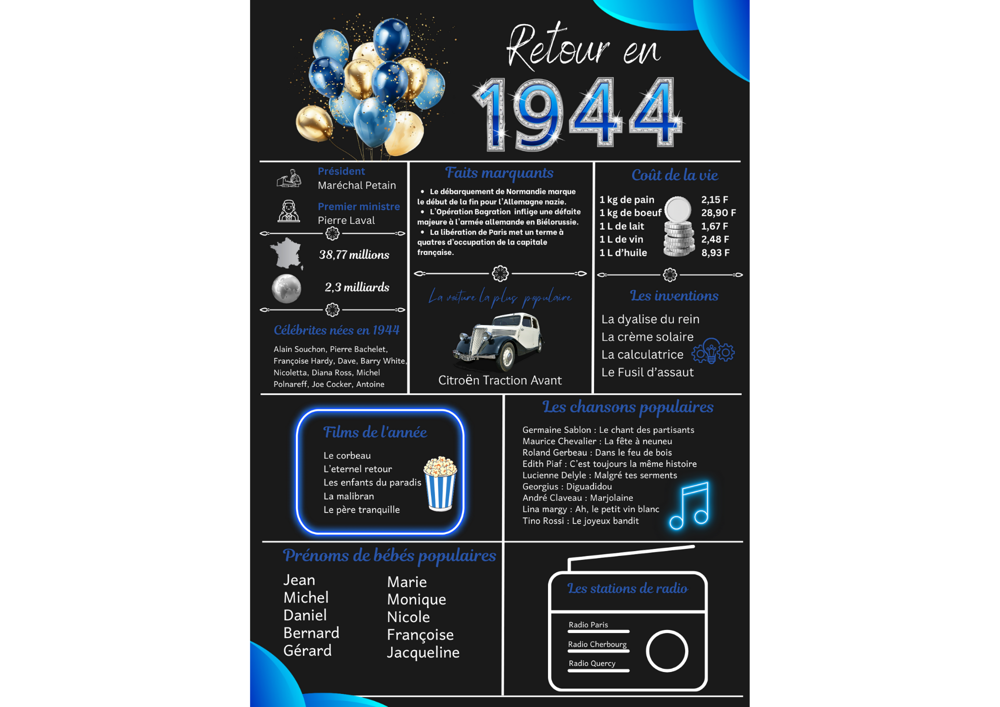 Affiche anniversaire 1944 disponible pour les années 1924 à 2014 Format numérique uniquement Idée cadeau mariage noel 80 ans
