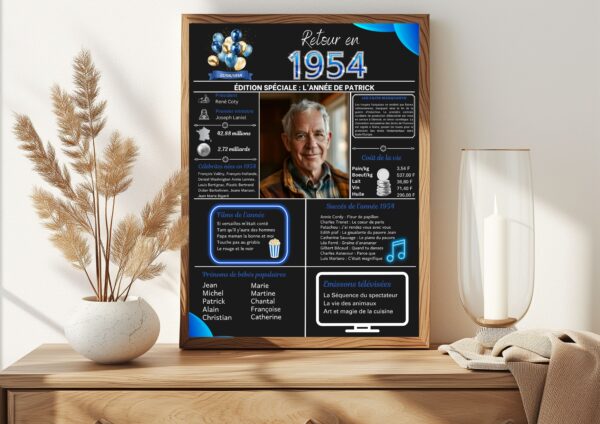 Nous proposons des affiches anniversaires pour l’année 1954 personnalisables avec l’ajout de photos et de textes. Nous disposons des affiches pour toutes les années de 1924 à 2014. Merci d’indiquer l’année et les informations de personnalisation au moment de la commande