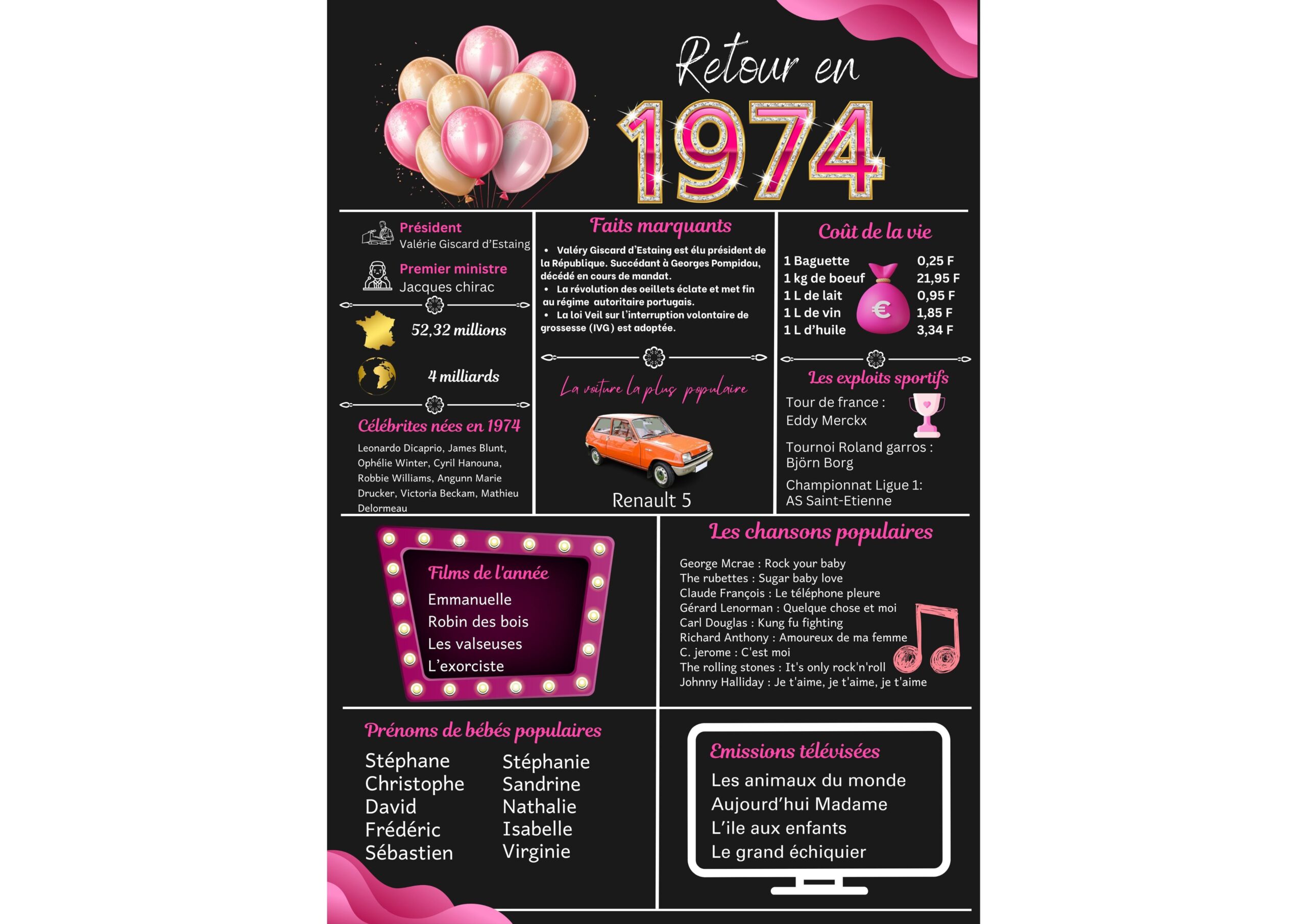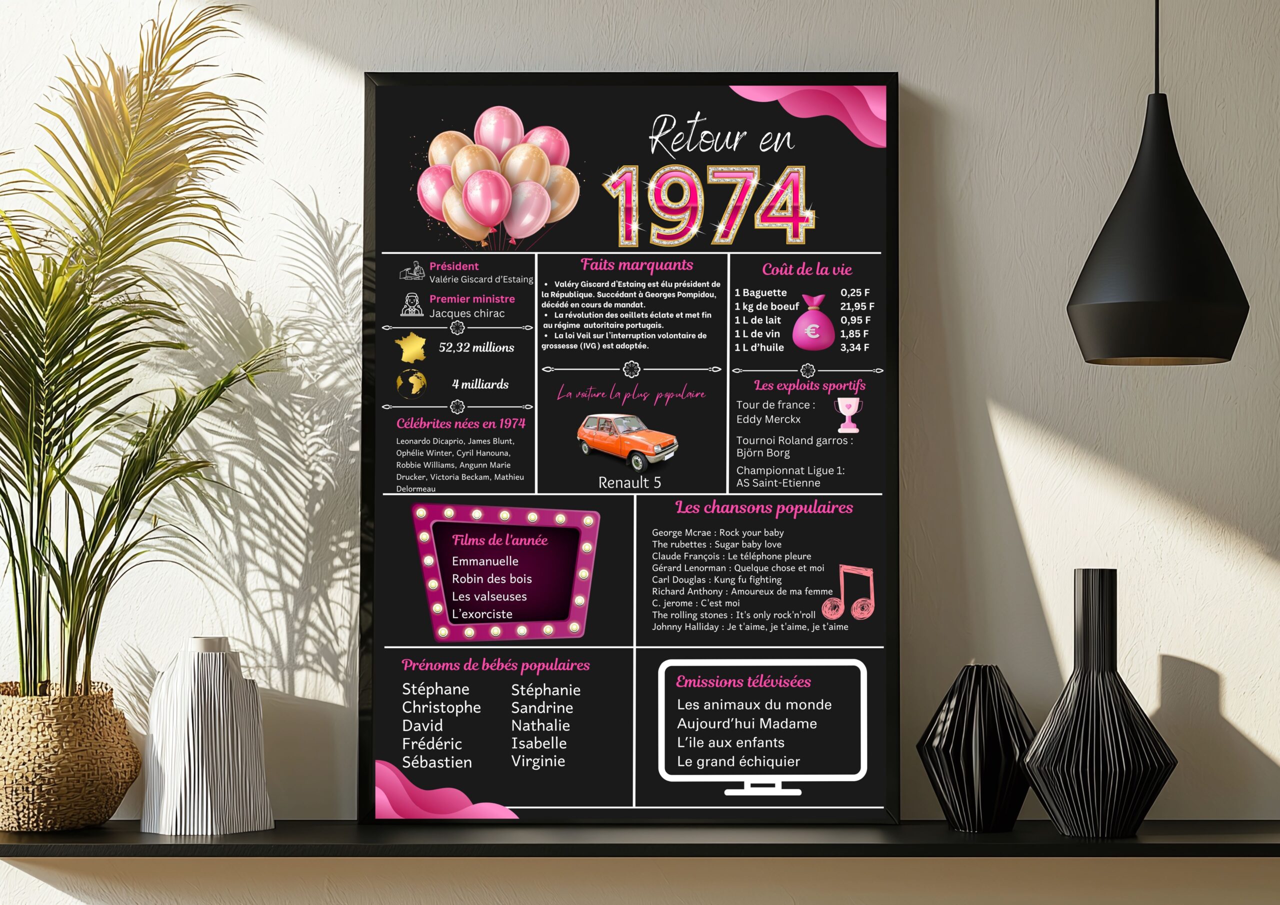 Affiche anniversaire 1974 disponible pour les années 1924 à 2014 Format numérique uniquement Idée cadeau mariage noel