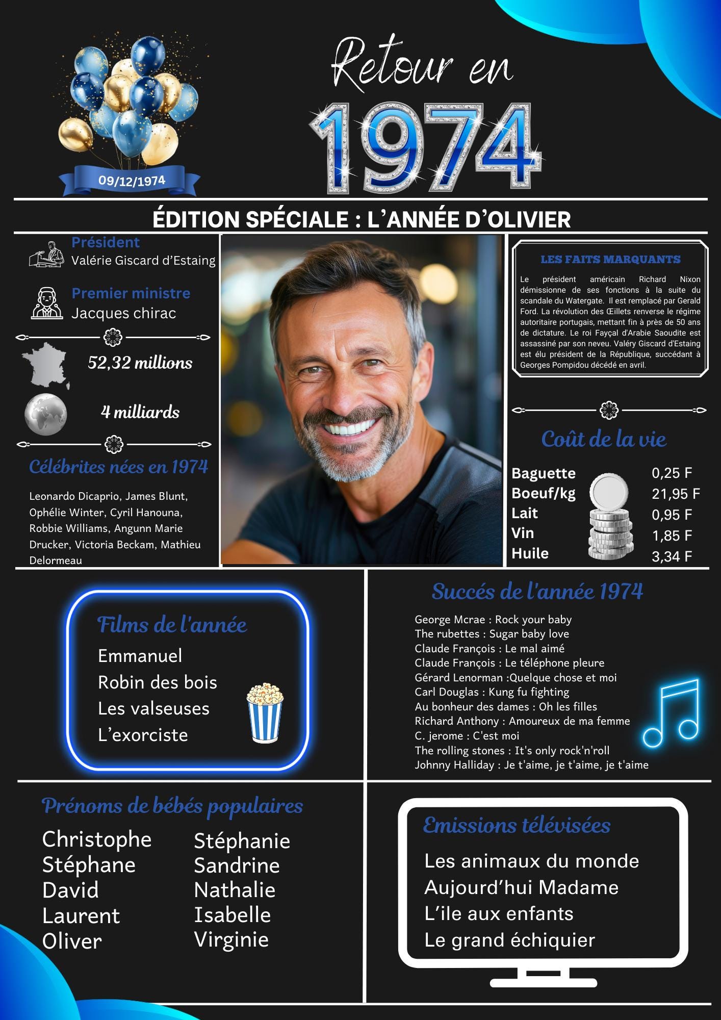 Affiche anniversaire 1974 personnalisable disponible pour les années 1924 à 2014 Format numérique ou imprimé A4 A3 sans cadre Idée cadeau
