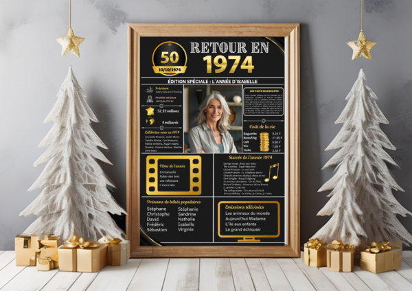 Nous proposons des affiches anniversaires pour l’année 1974 personnalisables avec l’ajout de photos et de textes. Nous proposons des affiches pour toutes années de 1924 à 2014. Si vous souhaitez une autre année, merci d’indiquer les informations de personnalisation au moment de la commande