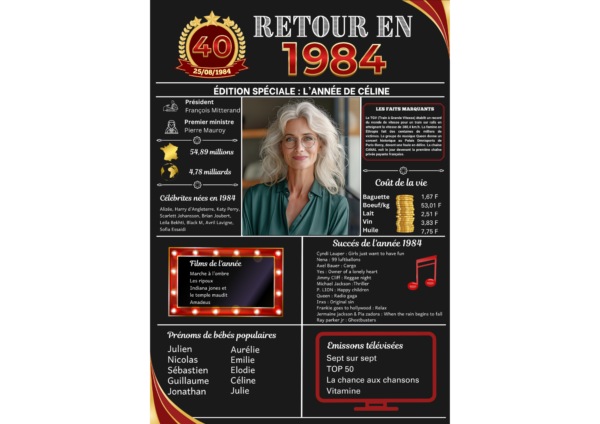 Nous proposons des affiches anniversaires pour l’année 1984 personnalisables avec l’ajout de photos et de textes. Nous disposons des affiches pour toutes les années de 1924 à 2014. Merci d’indiquer l’année et les informations de personnalisation au moment de la commande