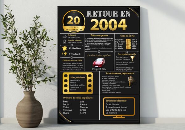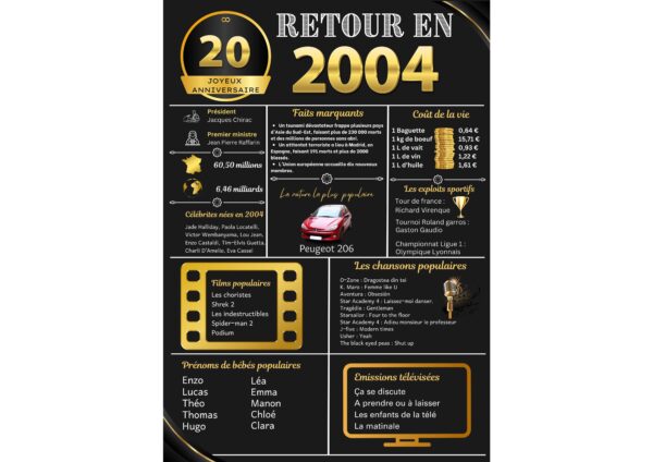 Nous proposons des affiches anniversaires pour l’année 2004. Elle sont disponibles pour toutes les années de 1924 à 2014. Si vous souhaitez une autre année, merci de l’indiquer au moment de la commande.