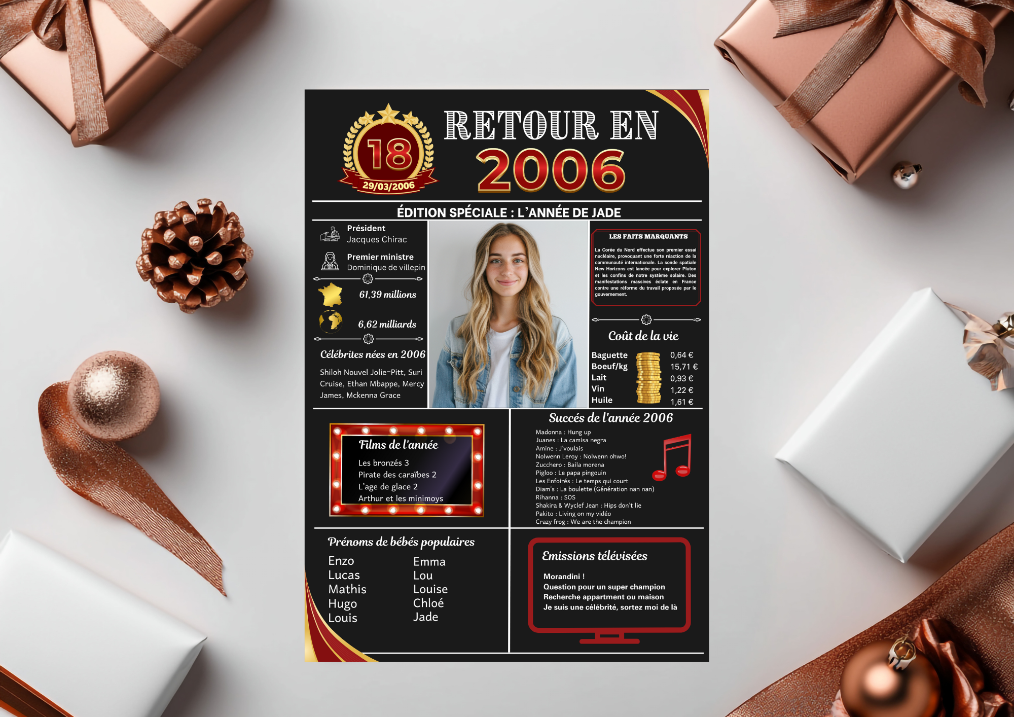 💝 Cette affiche personnalisable saura toucher son destinataire droit au coeur en lui remomérant les évenements et les moments clés de son année de naissance, de mariage, de rencontre, etc.