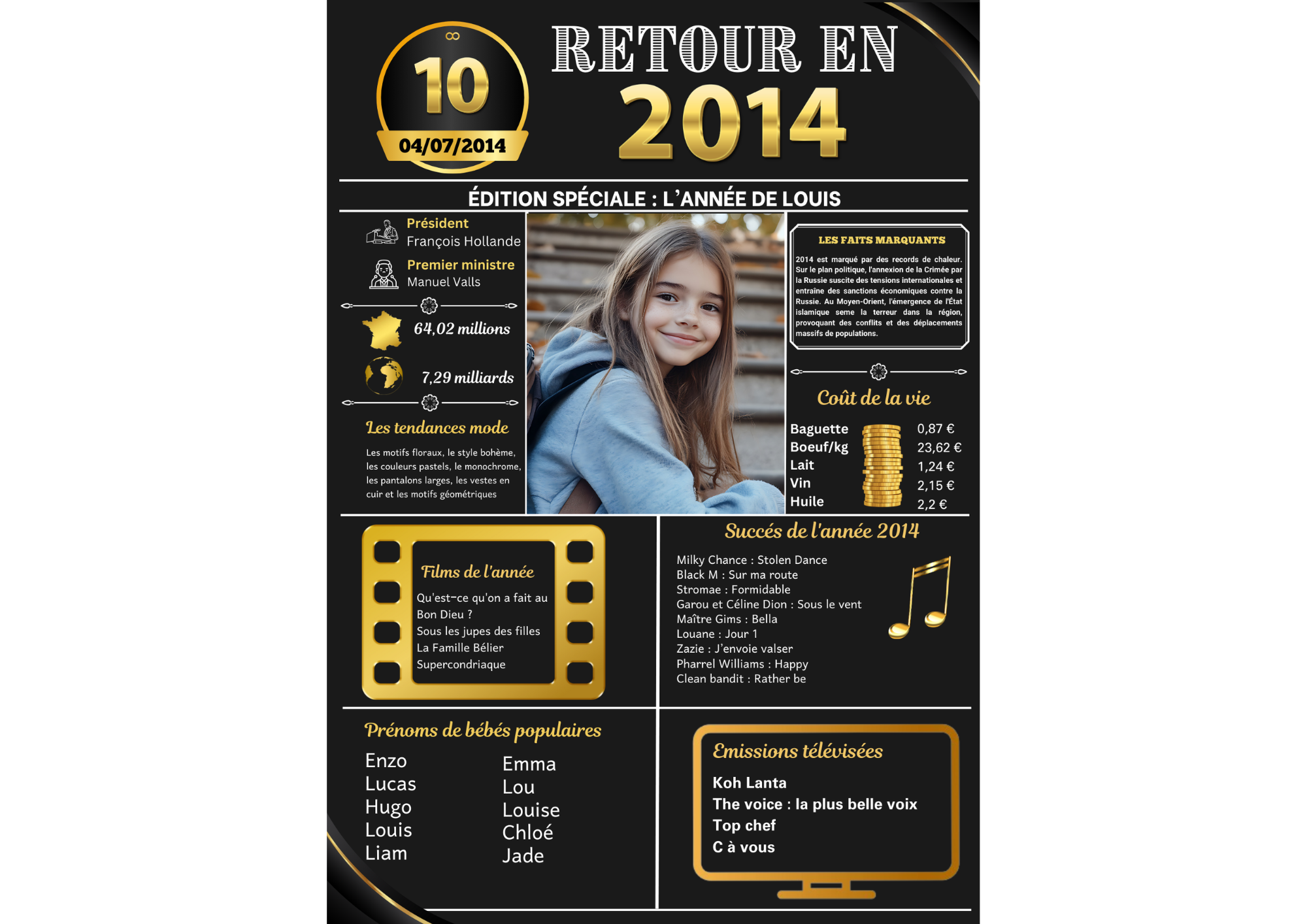 Nous proposons des affiches anniversaires pour l’année 2014 personnalisables avec l’ajout de photos et de textes. Nous disposons des affiches pour toutes les années de 1924 à 2014. Merci d’indiquer l’année et les informations de personnalisation au moment de la commande