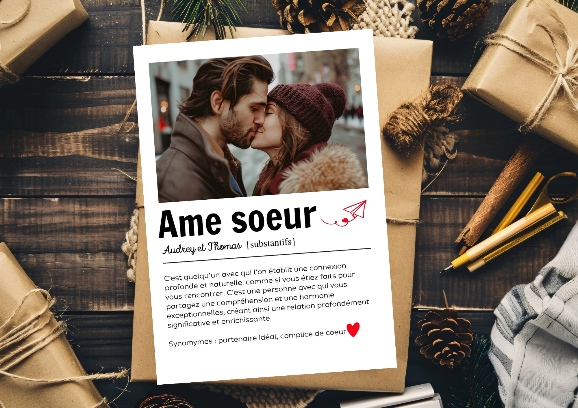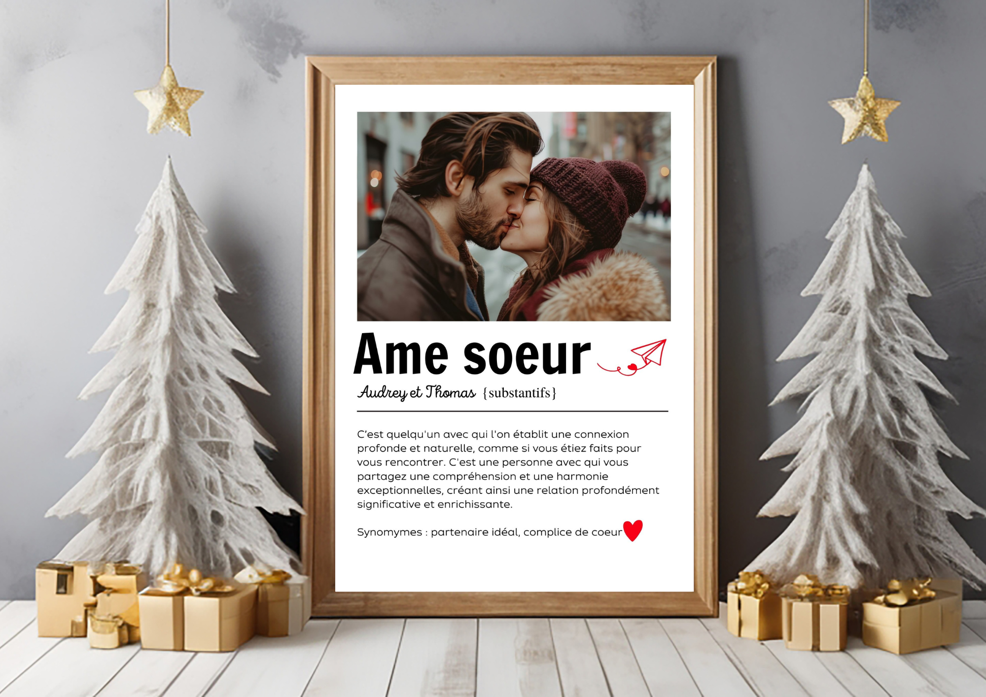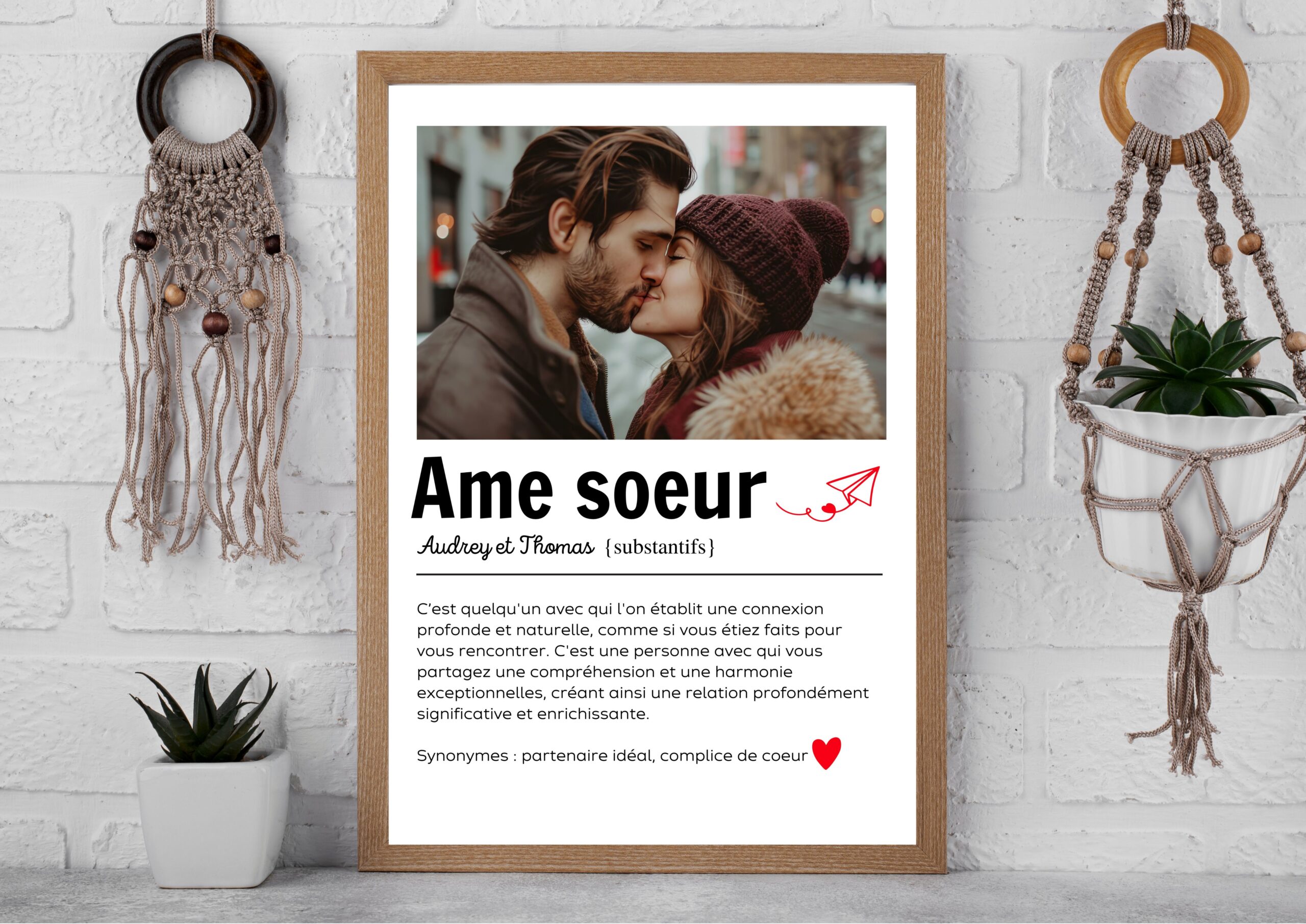 L’affiche « Définition Âme Sœur » est un cadeau parfait pour célébrer la relation unique et précieuse que vous partagez avec votre moitié. Que ce soit pour un anniversaire, la Saint-Valentin, un anniversaire de mariage, ou simplement pour exprimer tout l’amour que vous ressentez, cette affiche capturera l’essence de votre lien indéfectible. Avec un design élégant et romantique, elle symbolise à la fois l’amour profond et l’âme sœur avec qui vous partagez votre vie. Personnalisable avec un message spécial, cette affiche apportera une touche de tendresse et de romantisme à n’importe quel espace de vie.
