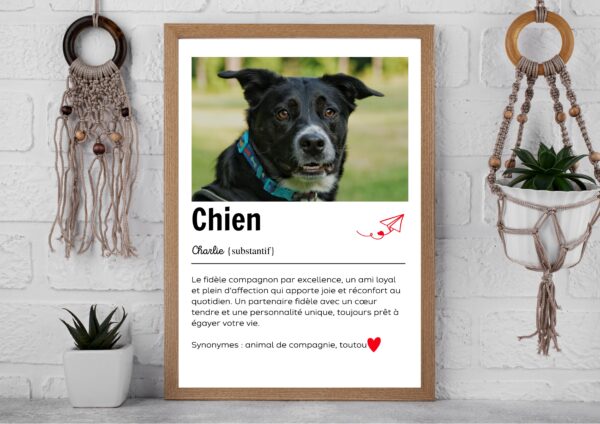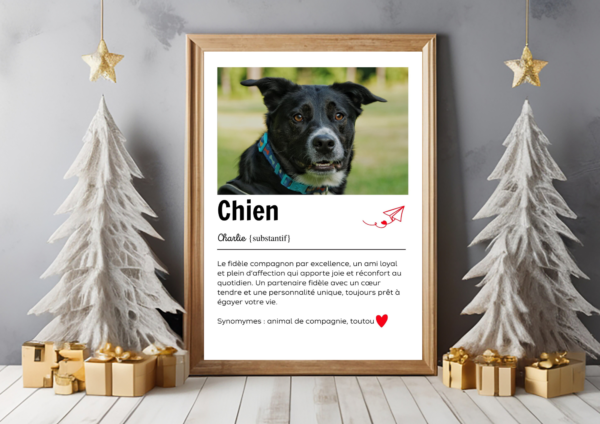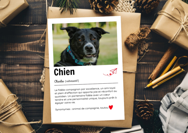 L’affiche « Définition Chien » est un cadeau parfait pour tous les amoureux des chiens qui souhaitent célébrer leur fidèle compagnon à quatre pattes. Personnalisable avec le prénom de votre chien, cette affiche capture avec tendresse et humour la relation spéciale qui existe entre un chien et son maître. Idéale pour décorer une maison ou offrir en cadeau à un ami, cette affiche ajoutera une touche de douceur et de style à n’importe quel espace de vie.