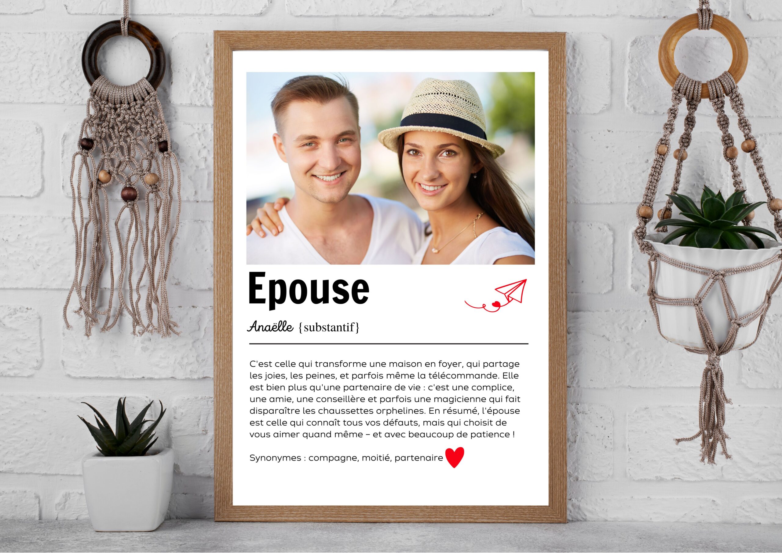 L’affiche « Définition Épouse » est un cadeau idéal pour exprimer toute l’admiration, l’amour et la tendresse que vous ressentez pour votre femme. Avec une touche d’humour et d’émotion, cette affiche personnalisée capture l’essence de ce que signifie être une épouse aimante, fidèle et dévouée. Que ce soit pour un anniversaire, un anniversaire de mariage, la Saint-Valentin ou simplement pour lui dire combien elle est spéciale, cette affiche apportera une touche d’élégance et de douceur à votre maison.