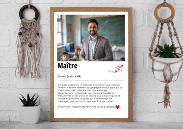 L’affiche « Définition Maître » est un cadeau idéal pour remercier et honorer un enseignant qui a marqué votre vie ou celle de votre enfant. Ce cadeau personnalisé exprime la gratitude pour la patience, l’engagement et les leçons de vie transmises par ce maître exceptionnel. Que ce soit pour la fin de l’année scolaire, une occasion spéciale, ou simplement pour montrer votre reconnaissance, cette affiche est un hommage touchant à un éducateur dévoué.