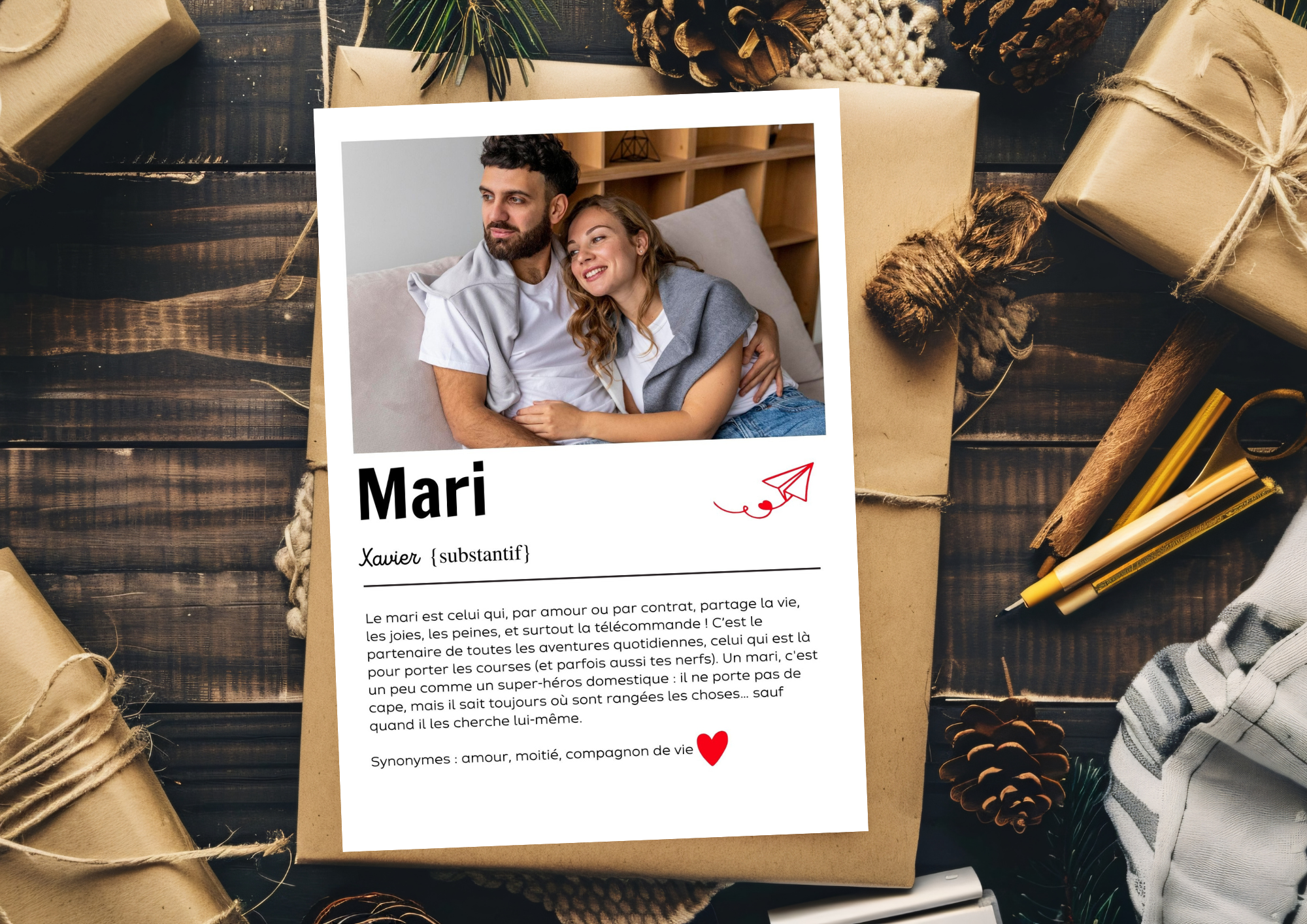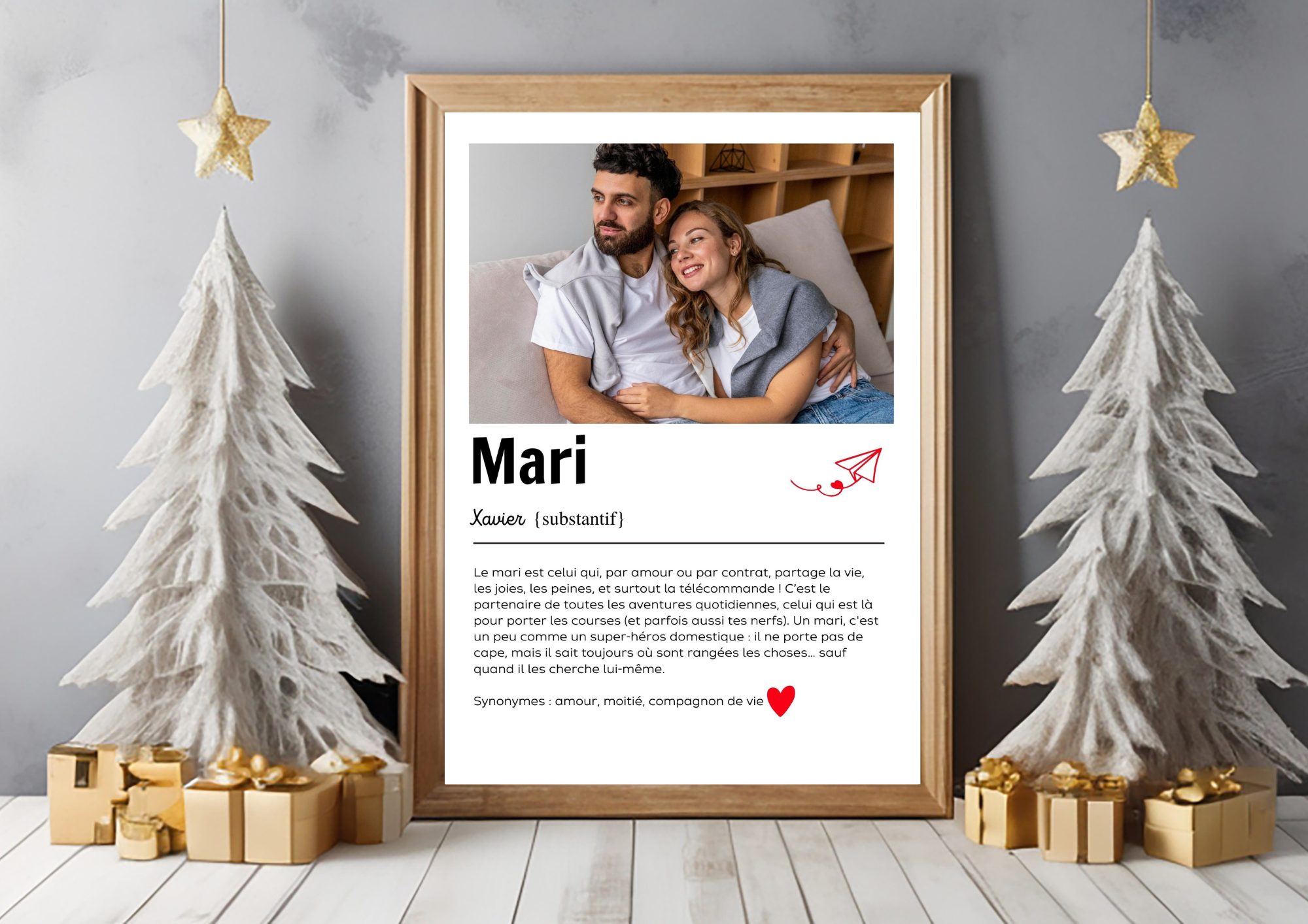 L’affiche « Définition Mari » est le cadeau parfait pour exprimer l’amour et l’admiration que vous ressentez pour votre mari. Avec une touche d’humour et de tendresse, cette affiche personnalisée capture l’essence de ce que signifie être un mari aimant, attentionné et protecteur. Que ce soit pour un anniversaire, un anniversaire de mariage, la Saint-Valentin ou juste pour dire « je t’aime », cette affiche sera un ajout touchant et significatif à votre décoration intérieure, apportant chaleur et amour à votre maison.