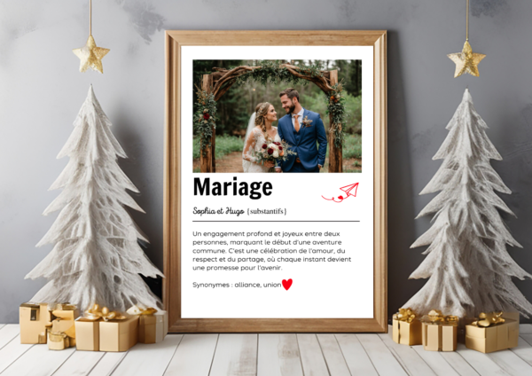 L’affiche « Définition Mariage » est un cadeau parfait pour immortaliser un moment aussi spécial que le mariage. Conçue pour capturer l’essence de l’amour, de l’engagement et de la complicité qui unissent deux personnes, cette affiche personnalisée est idéale pour offrir à des jeunes mariés ou pour décorer votre propre maison. Que ce soit pour un anniversaire de mariage, une pendaison de crémaillère ou simplement pour exprimer la beauté de l’union, cette affiche saura embellir n’importe quel espace de vie avec élégance et amour.
