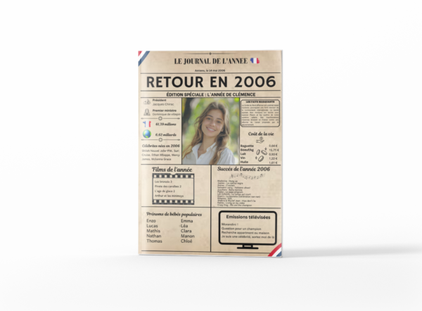 Merci de préciser l’année souhaitée au moment de la commande, d’indiquer la ville et la date de naissance et de renseigner le prénom (EDITION SPECIALE : L’ANNEE DE ROBERT) ou le texte à ajouter (ex : Joyeux anniversaire Pascal, etc).