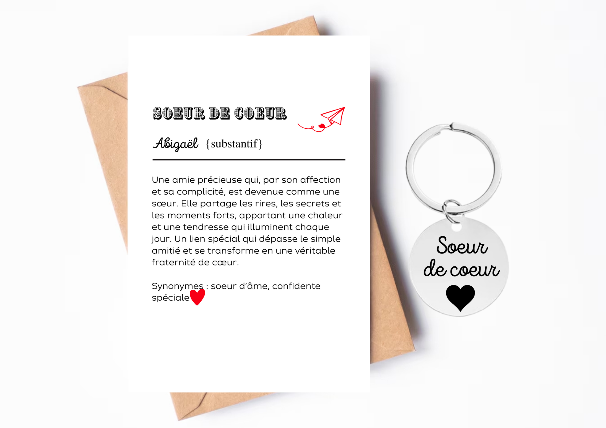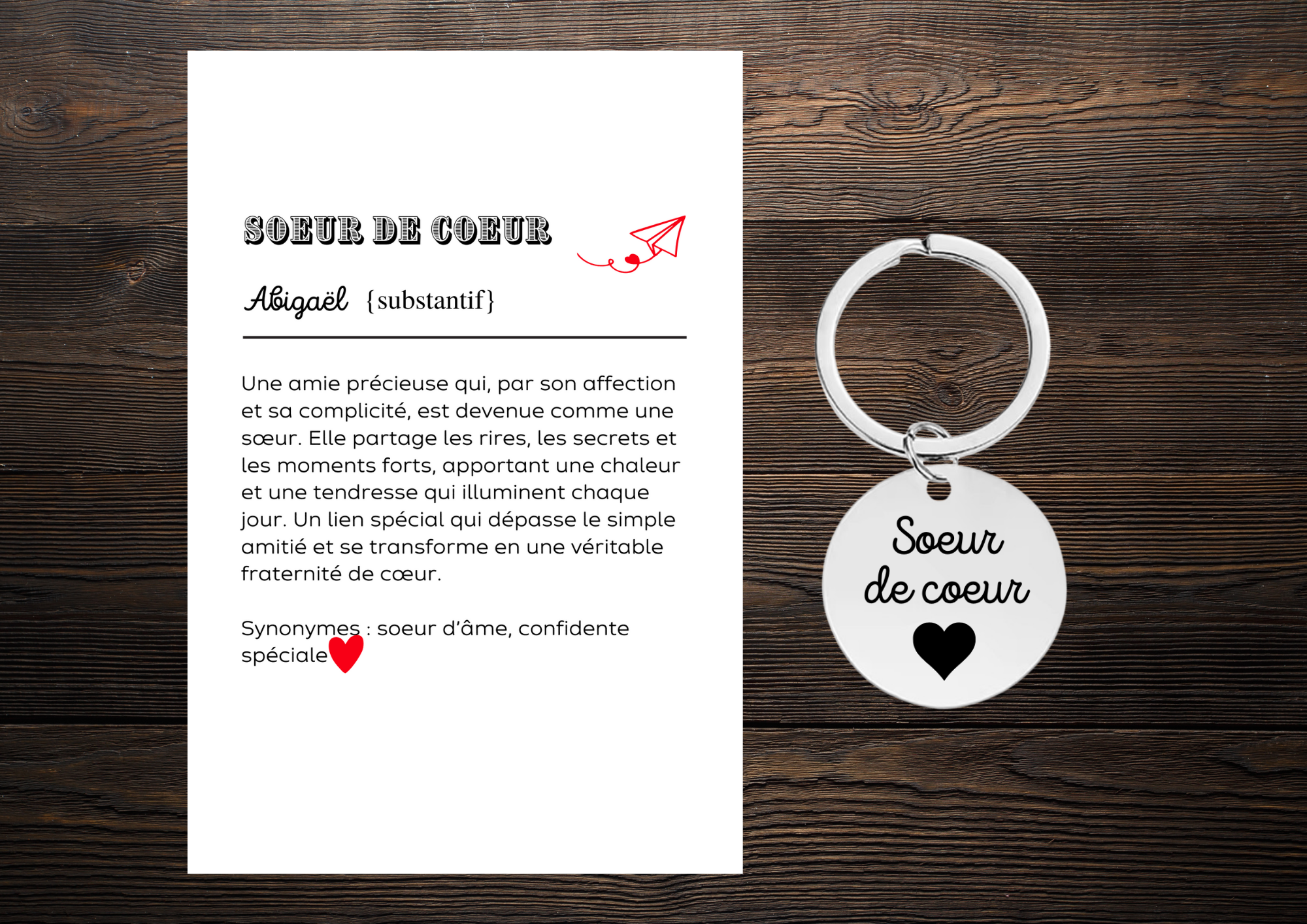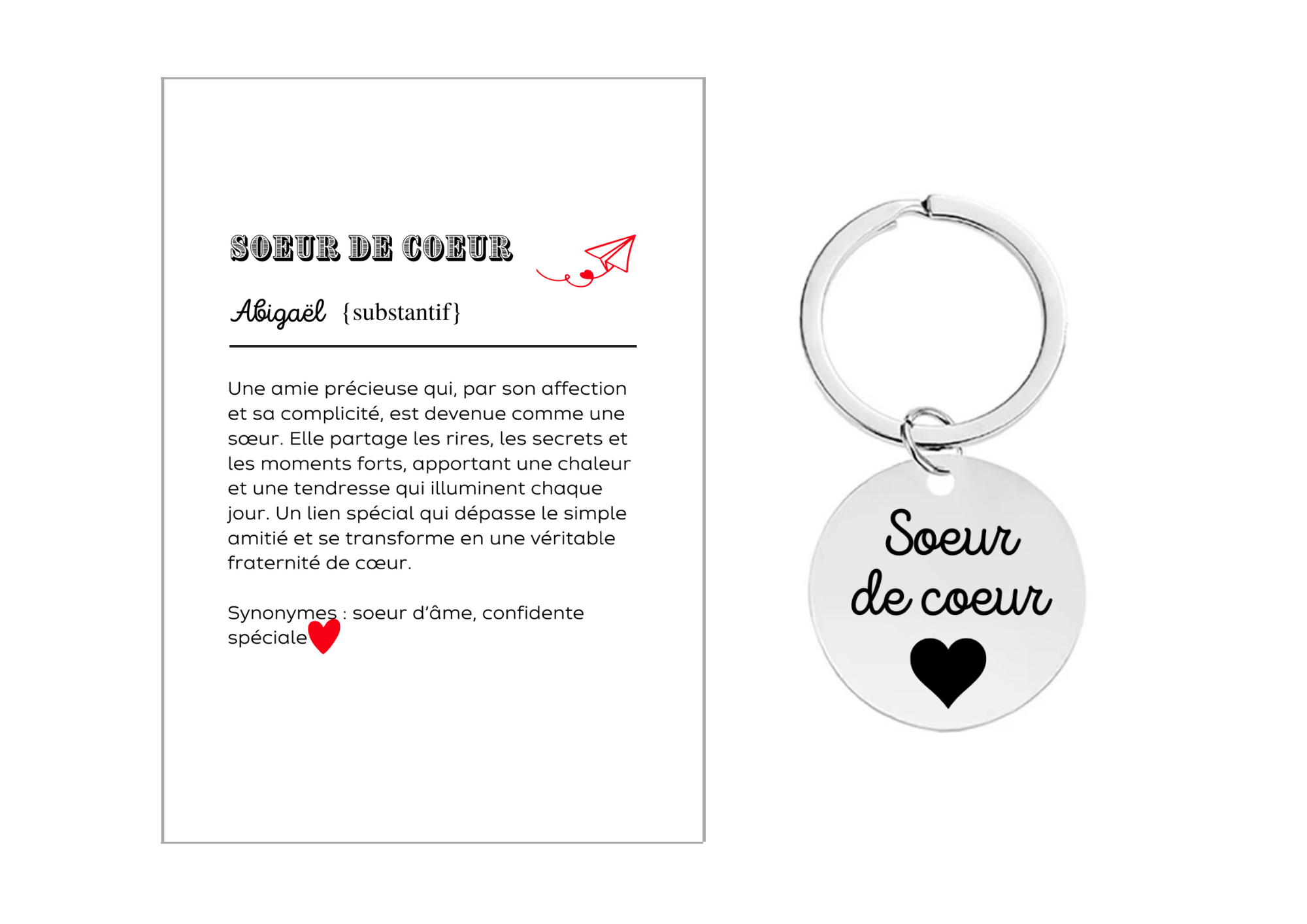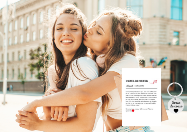 Offrez à votre soeur de coeur un porte-clé symbolique et touchant, accompagné d’une carte avec un