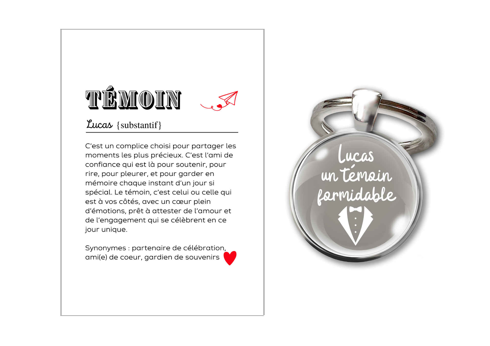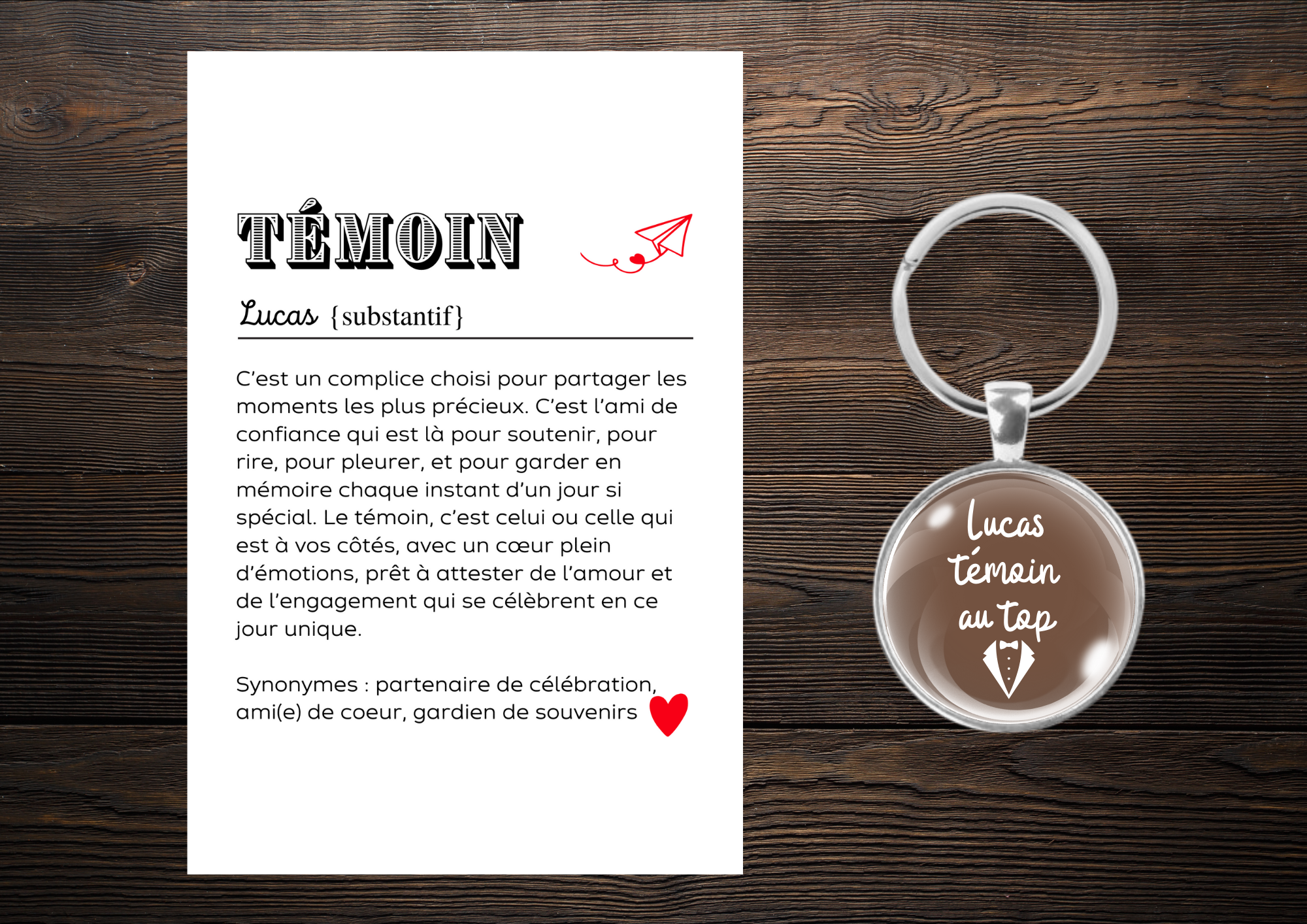 Ce porte-clés est un cadeau parfait pour remercier votre témoin de mariage, cette personne spéciale qui a accepté de se tenir à vos côtés lors de l’un des plus beaux jours de votre vie.