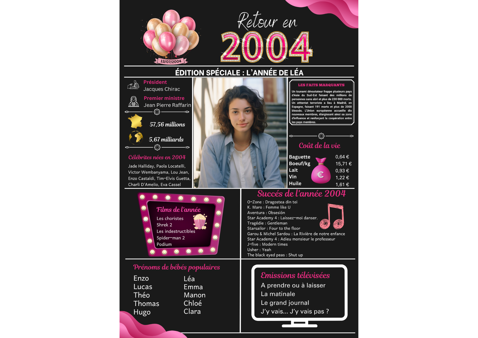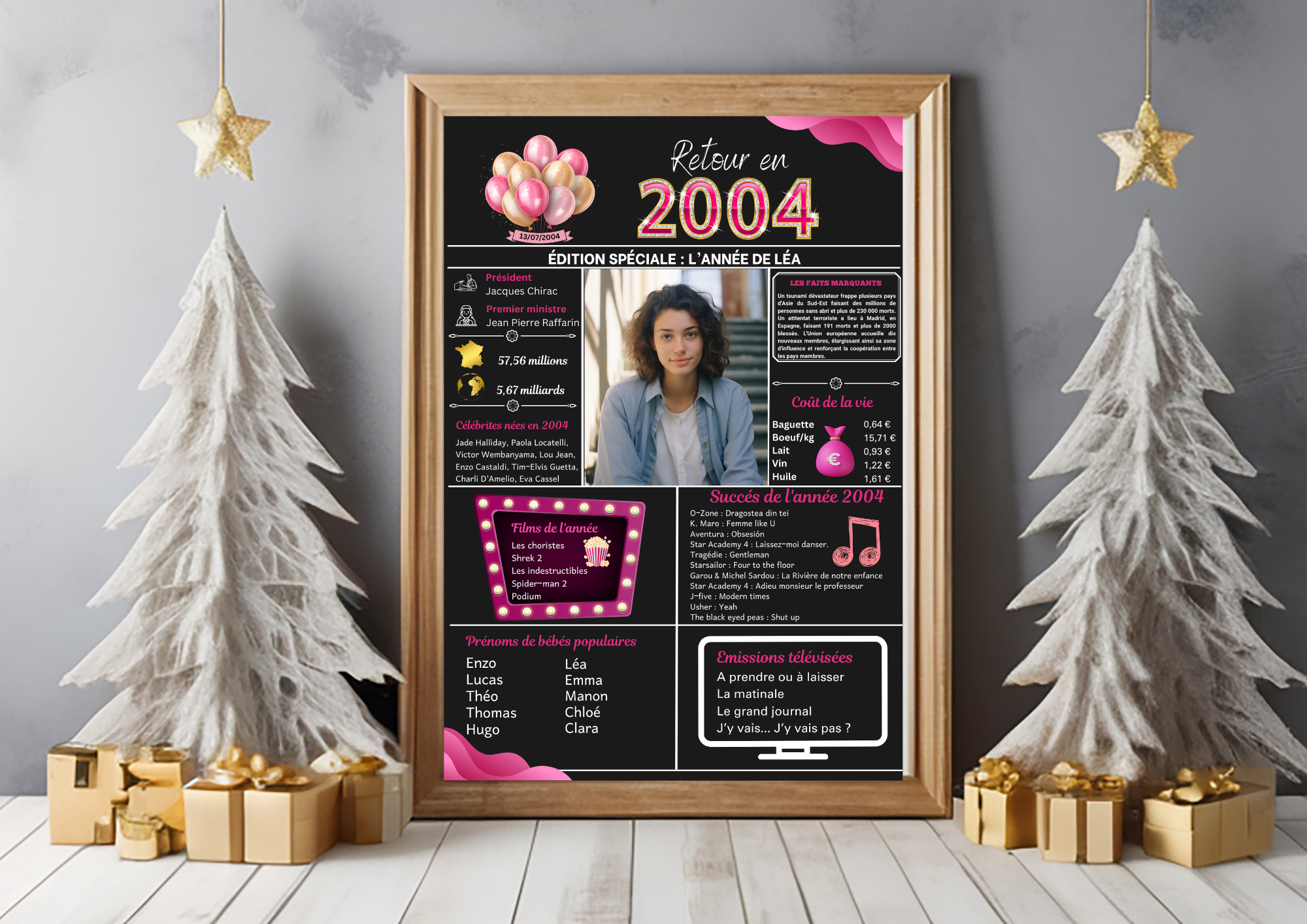 💝 Cette affiche personnalisable saura toucher son destinataire droit au coeur en lui remomérant les évenements et les moments clés de son année de naissance, de mariage, de rencontre, etc.